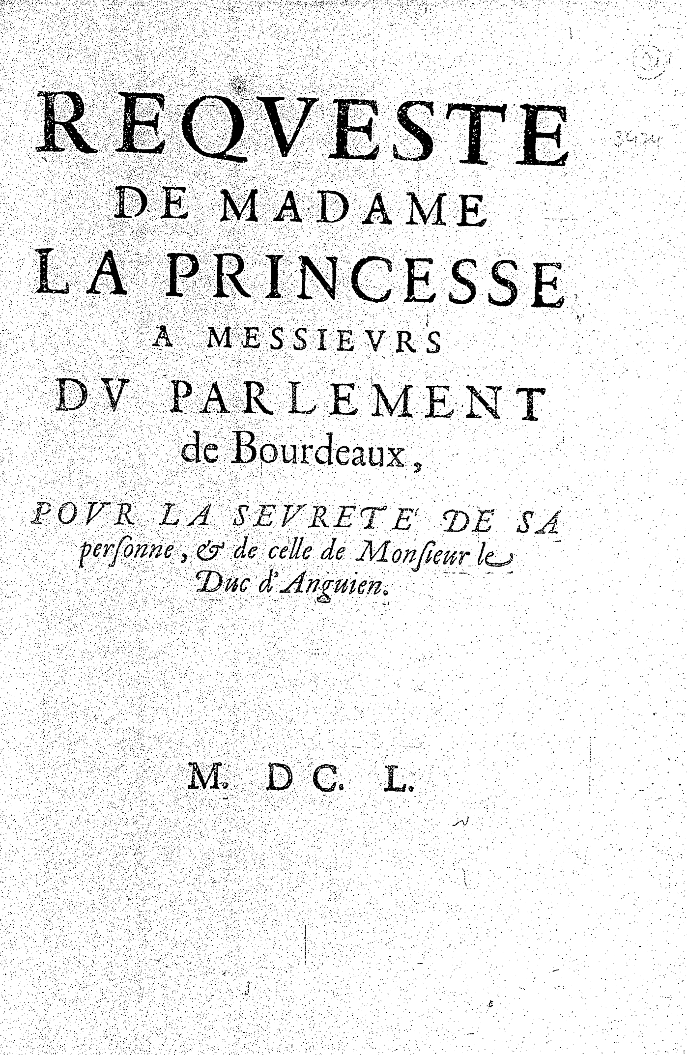 REQVESTE DE MADAME LA PRINCESSE A MESSIEVRS DE PARLEMENT de Bourdeaux, POVR LA SEVRETE DE SA personne, & de celle de Monsieur le Duc d’Anguien.