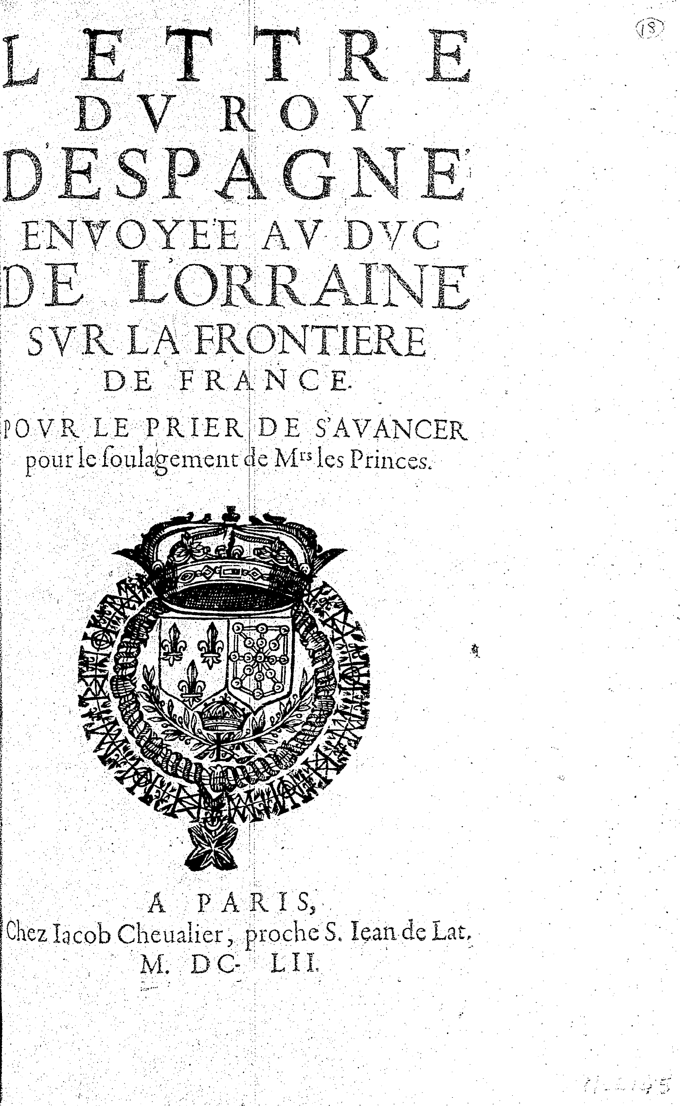 LETTRE DV ROY D’ESPAGNE ENVOYÉE AV DVC DE L’ORRAINE SVR LA FRONTIERE DE FRANCE. POVR LE PRIER DE S’AVANCER pour le soulagement de Mrs les Princes.